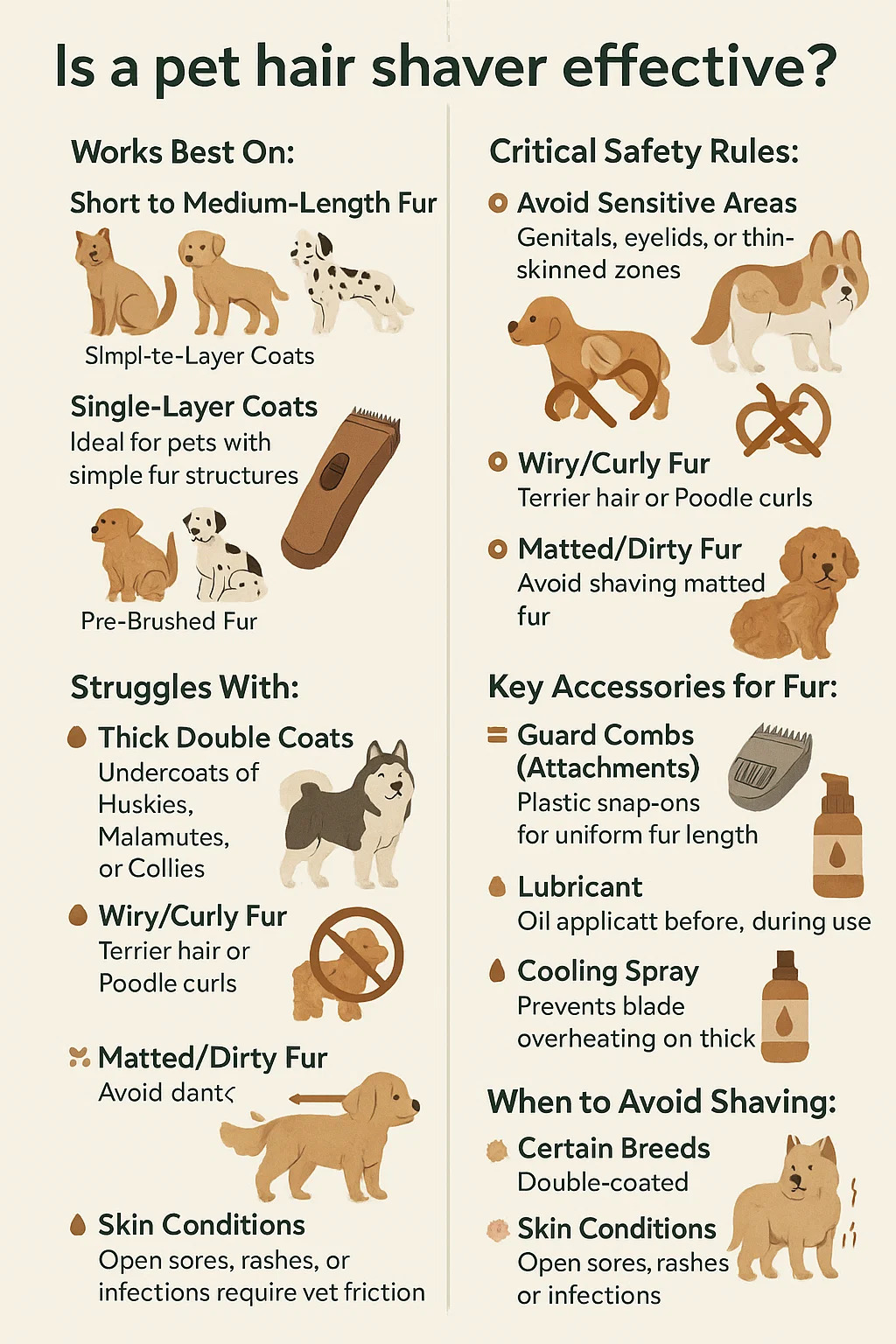 Kyllä, a lemmikkieläinten parranajokone (kutsutaan myös PET -leikkureiksi tai trimmereiksi) on erityisesti suunniteltu toimimaan eläinten turkista, mutta tehokkuus riippuu turkista, työkalujen laadusta ja tekniikasta. Alla on yksityiskohtainen erittely: