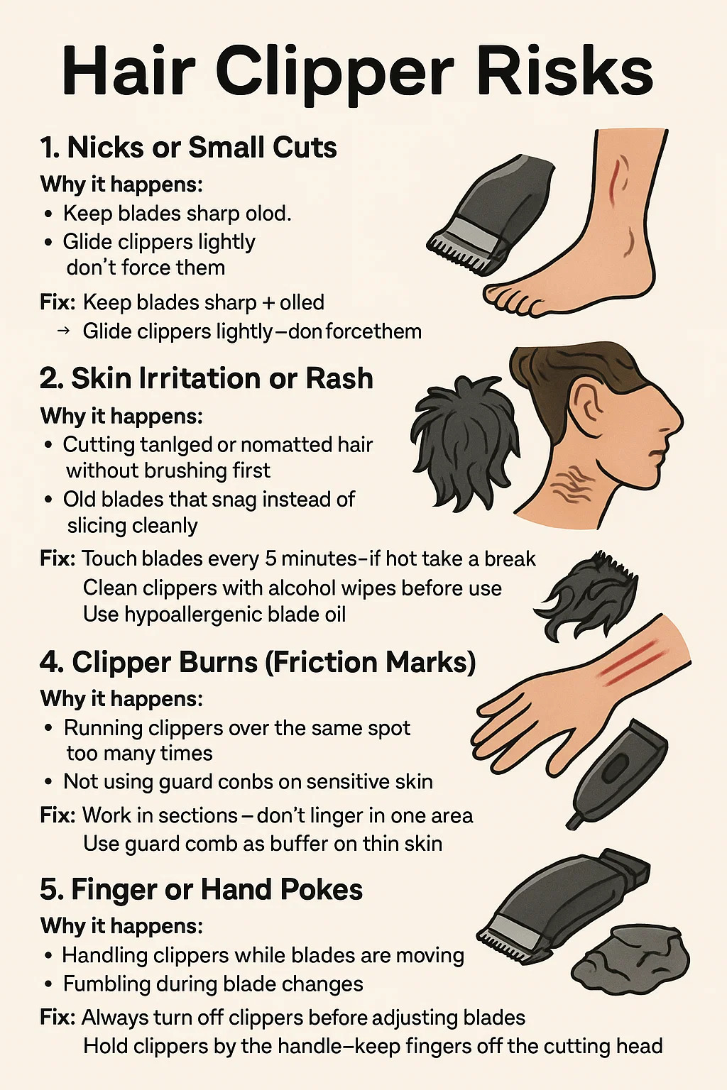 Kyllä, käyttämällä a hiustenleikkuukone voi aiheuttaa pieniä vammoja tai epämukavuutta, jos sitä ei käsitellä huolellisesti. Tässä on selkeä erittely yleisistä riskeistä ja niiden välttämisestä: